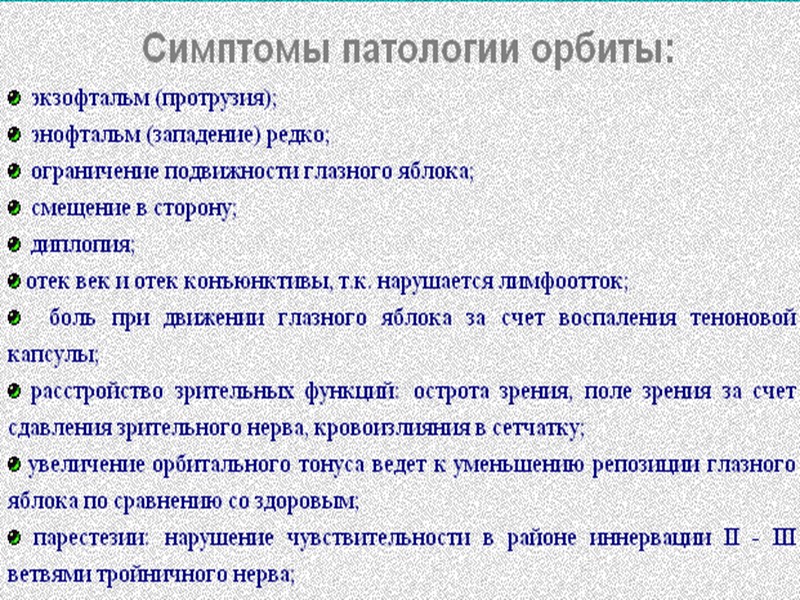 Острые заболевания орбиты: Острые заболевания орбиты развиваются внезапно, характеризуются быстрым нарастанием симптомов: экзофтальма, боли, снижения зрения, диплопии. Процесс чаще всего носит односторонний характер. К заболеваниям орбиты, требующим неотложной терапии, относятся: воспалительные процессы, кровоизлияния в ткани орбиты и сосудистая патология.