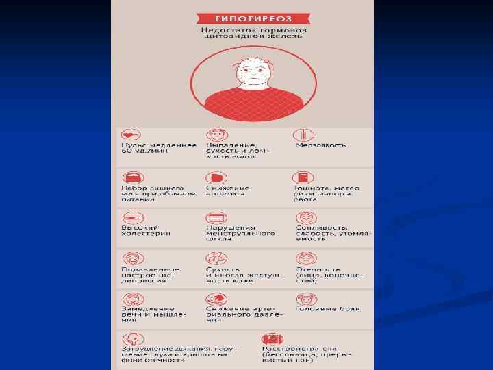 Гипотериоз Гипотиреоз - состояние, возникающее при недостатке тиреоидных гормонов в организме. Так же, как и гипертиреоз, он может быть первичным, вторичным и третичным. Первичный гипотиреоз встречается при тиреоидите Хасимото, дефектах биосинтеза тиреоидных гормонов, тиреоидэктомии, лечении радиоактивным йодом, недостаточном поступлении йода в организм и других патологических процессах в железе. Вторичный и третичный гипотиреоз являются следствием выпадения регуляторных влияний (поражения гипофиза, дефицит тиролиберина). Наиболее выраженную форму гипотиреоза у взрослых называют микседемой. Синдром, который развивается у детей в связи с полной недостаточностью щитовидной железы, называют кретинизмом. Кретинизм характеризуется выраженной задержкой роста и своеобразной внешностью больного. В основе кретинизма лежит, как правило, аплазия щитовидной железы.