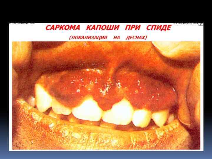 Наиболее достоверным клиническим критерием при распознавании СПИДа, бесспорно, следует признать саркому Капоши. При саркоме Капоши висцерального типа заболевание первоначально и преимущественно поражает внутренние органы, особенно органы пищеварения. Кожные покровы и видимые слизистые оболочки вовлекаются вторично. Наружные проявления сначала немногочисленны и локализуются главным образом в полости рта, особенно на твердом небе, и в области гениталий. При дермальном типе первично поражаются кожные покровы и слизистые оболочки.