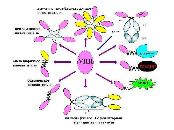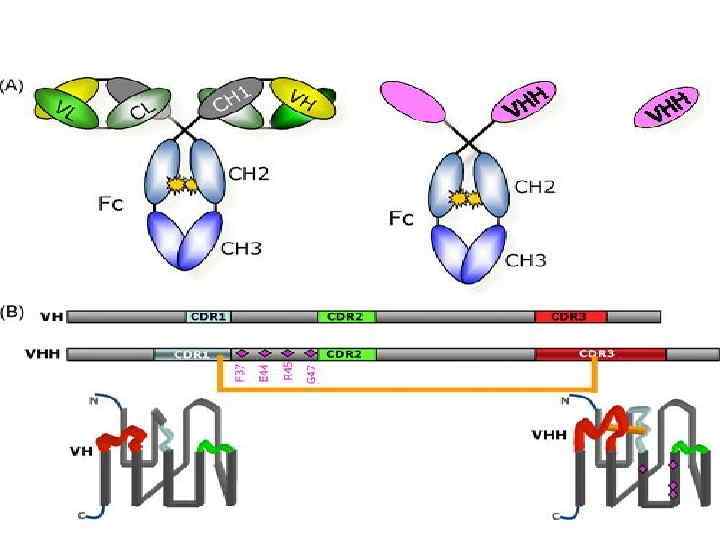 Наноантитела, их происхождение. • На слайде справа изображен Ig. G 2, Ig. G 3 верблюда , которые состоят только из тяжелых цепей и в них отсутствует СН 1. За счет этого удлиняется шарнирный участок и АТ этого класса могут связываться со многими АГ. Активные центры таких АТ и называются наноантителами. Это самые маленькие структуры, которые могут связываться с эпитопами на АГ. Имеют большие перспективы для использования в практике.