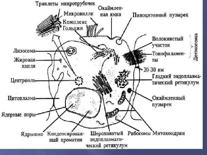Ультраструктуры клетки Ядро (оболочка с ядерными порами, кариоплазма, ядрышки и перинуклеарное пространство); цитоплазма: гиалоплазма с различными органеллами и включениями: Органеллы мембранного происхождения: цитоплазматическая мембрана (включая десмосомы); митохондрии: (наружная оболочка, кристы, матрикс); аппарат Гольджи; эндоплазматический ретикулум: гладкий; гранулярный (шероховатый); лизосомы: первичные, вторичные: цитолизосомы и фаголизосомы; остаточные тельца или телолизосомы.