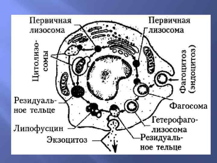 Вторичные лизосомы Первичные лизосомы + другие вакуоли - , выброс содержимого = вторичные лизосомы: пинолизосомы, фаголизосомы аутофаголизосомы. Неполный фагоцитоз - резидуальные (остаточные) тельца, или телолизосомы,