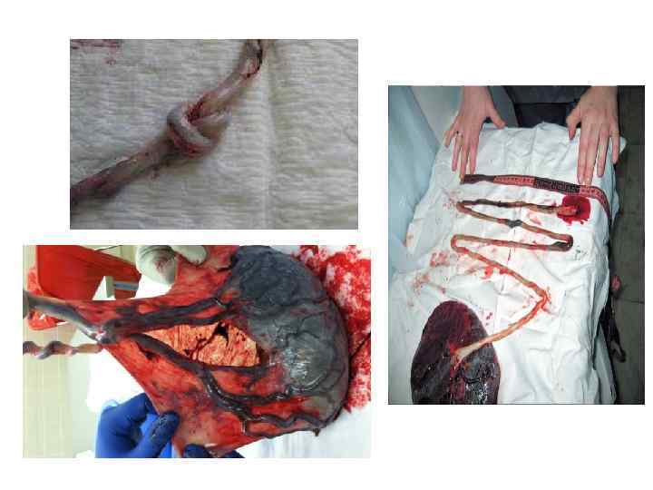 Аномалии пуповины: • Тощая пуповина ( масса 0, 5 г/см и менее) • Предлежание пуповины ( петли пуповины расположены ниже предлежащей части плода) • Выпадение пуповины ( при отсутсвии плодного пузыря) • Абсолютная короткость пуповины ( длина менее 40 см) • Длинная пуповина ( длина более 70 см) • Оболочечное прикрепление пуповины ( пуповина прикрепляется не к плацентарному диску а к плодным оболочкам) • Гиперизвитая пуповина ( на 10 см длины пуповины более 3 -х витков сосудов) • Гипоизвитая пуповина ( на 10 см длины пуповины менее 1 витка сосудов) • Единственная пупочная артерия • Гематома пуповины • Истинный узел пуповины