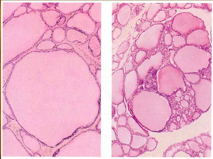 ГИСТОЛОГИЯ n n Структурной единицей щитовидной железы является фолликул, представляющий собой отграниченное эпителиальным пластом полостное образование размером от 20 до 300 мкм. Фолликулы ЩЖ расположены в соединительнотканной строме, сформированной из коллагеновых и эластических волокон, с проходящими в ней кровеносными, лимфатическими сосудами и нервами.