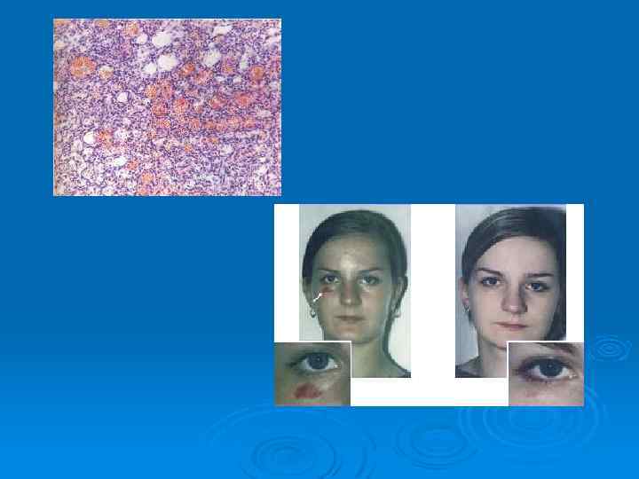 Гемангиомы Кавернозная – встречается редко, у взрослых, имеет вид венозного узла в коже века Ø Рацемозная гемангиома (венозная, артериальная, смешанная) – развивается с 5 летнего возраста, прорастает в мягкие ткани, распространяется в орбиту, смещает , глаз (репозиция свободная). При венозной – экзофтальм увеличивается, набухают вены пер. отдела орбиты; при артериальной – сопровождается пульсацией. Распространяется в полость черепа. Ø Лечение: при венозной – иссечение, при артериальной и смешанной –лигирование приводящих и отводящих сосудов. Ø Прогноз: неблагоприятный (в течение всей жизни продолжается рост, страдает глаз на стороне поражения) Ø