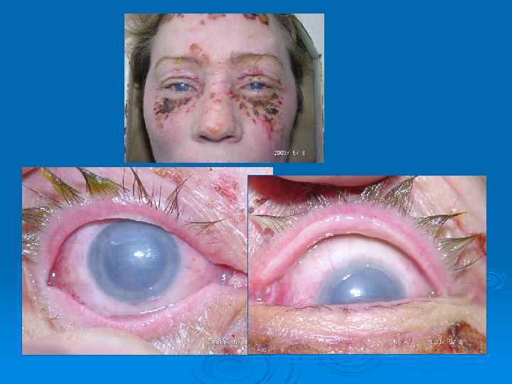 Воспалительная патология век Простой блефарит: умеренное покраснение и зуд век, едкое пенистое отделяемое, повышенная утомляемость Ø Чешуйчатый блефарит: края век утолщены, красные, кожа у корня ресниц покрыта чешуйками Ø Ø Язвенный блефарит: засохший гнойный секрет мейбомиевых желез образует желтые гнойные корки→трихиаз, деформация краев, заворот, выворот век.