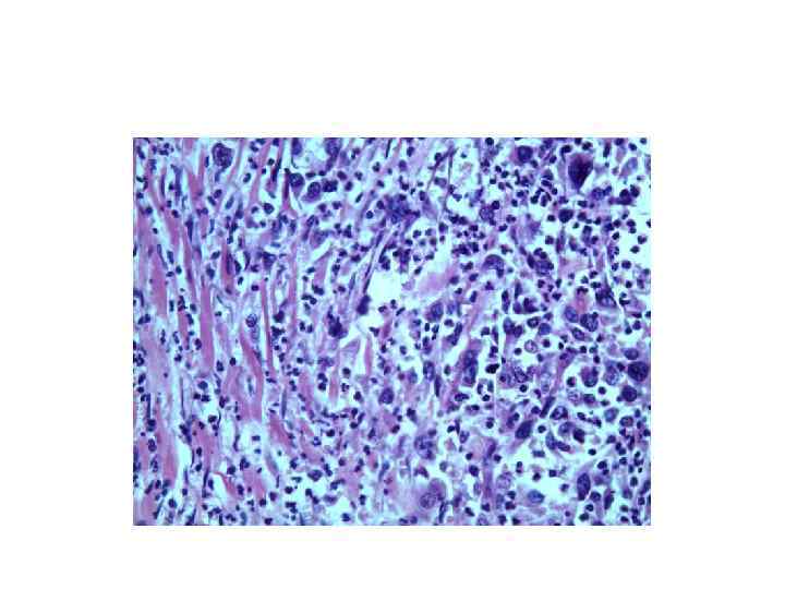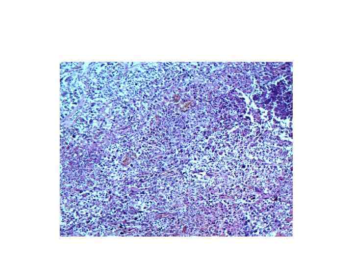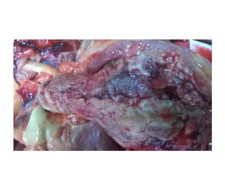 ПАТОЛОГОАНАТОМИЧЕСКИЙ ДИАГНОЗ • • • ОСНОВНОЕ: Мультицентрический низкодифференцированный рак правого легкого с множественными метастазами в легкие; в лимфатические узлы перибронхиальные, паратрахеальные и шейные; метастаз в межжелудочковую перегородку правого желудочка сердца с пермеацией в просвет легочной артерии. Повторные курсы комбинированного лечения в 2013 г (по данным анамнеза). ОСЛОЖНЕНИЯ: Стеноз просвета ствола легочной артерии метастазом рака легких (клинически до 70%). Хроническое общее венозное полнокровие: мускатная печень, цианотическая индурация почек и селезенки. Двусторонний гидроторакс (700 мл справа и 500 мл – слева). Гидроперикард (100 мл). Жировая дистрофия миокарда и печени. Печеночно-почечная недостаточность: мочевина крови 28, 0 ммол/л; билирубин 33, 7 мемол/л (клинически). Асистолия (клинически). Отек легких и головного мозга. СОПУТСТВУЮЩИЕ: Диффузный мелкоочаговый кардиосклероз. Атеросклероз коронарных артерий сердца с преимущественным поражением правой коронарной артерии (фиброзные бляшки), артерий основания головного мозга (фиброзные блячшки), аорты (фиброзные бляшки). Почечная артериальная гипертензия: эксцентрическая гипертрофия миокарда (масса сердца 450 г, толщина стенки левого желудочка 1, 8 см: правого – о, 3 см). Хронический двусторонний пиелонефрит в стадии ремиссии. Пиелонефритические почки. Хронический диффузный бронхит в стадии ремиссии. Диффузный сетчатый пневмосклероз. Кровопотек мягких тканей теменной области (1, 5 х1, 8 см).