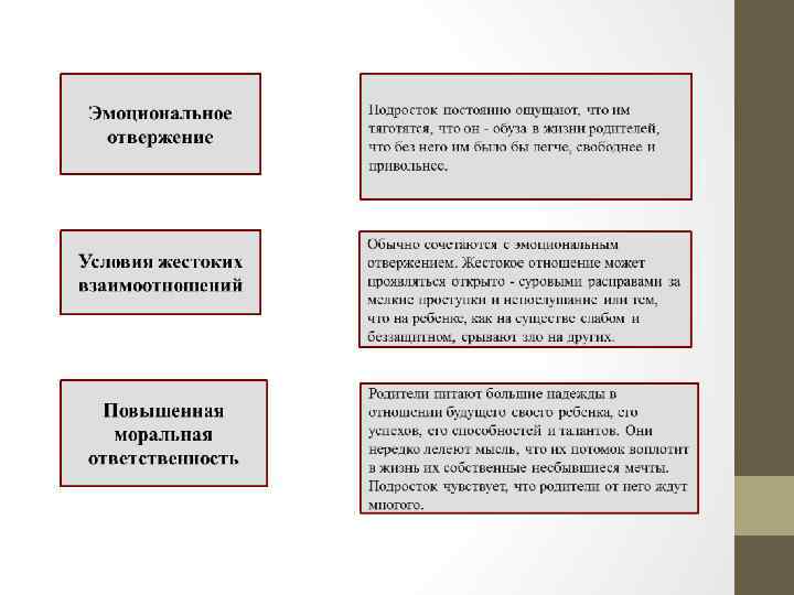 Истероидный тип Тип неблагоприятного воспитания: потворствующая гиперпротекция, эмоциональное отвержение 1. ДЕМОНСТРАТИВНОЕ СУИЦИДАЛЬНОЕ ПОВЕДЕНИЕ; 2. АЛКОГОЛИЗАЦИЯ ТАКЖЕ МОЖЕТ НОСИТЬ ЧИСТО ДЕМОНСТРАТИВНЫЙ ХАРАКТЕР; 3. РЕАКЦИЯ ЭМАНСИПАЦИИ МОЖЕТ ИМЕТЬ БУРНЫЕ ВНЕШНИЕ ПРОЯВЛЕНИЯ — ПОБЕГИ ИЗ ДОМУ, КОНФЛИКТЫ С РОДНЫМИ И СТАРШИМИ, ГРОМОГЛАСНЫЕ ТРЕБОВАНИЯ СВОБОДЫ И САМОСТОЯТЕЛЬНОСТИ; 4. ДЕЛИНКВЕНТНОСТЬ ОБЫЧНО НОСИТ НЕСЕРЬЕЗНЫЙ ХАРАКТЕР. ЭТО ПРОГУЛЫ, НЕЖЕЛАНИЕ УЧИТЬСЯ И РАБОТАТЬ. ИНОГДА МОШЕННИЧЕСТВО, ВОРОВСТВО; 5. ПОБЕГИ ИЗ ДОМУ МОГУТ НАЧИНАТЬСЯ ЕЩЕ С ПЕРВЫХ КЛАССОВ ШКОЛЫ. ОБЫЧНО ОНИ ВЫЗВАНЫ НАКАЗАНИЯМИ, РЕАКЦИЕЙ ОППОЗИЦИИ.