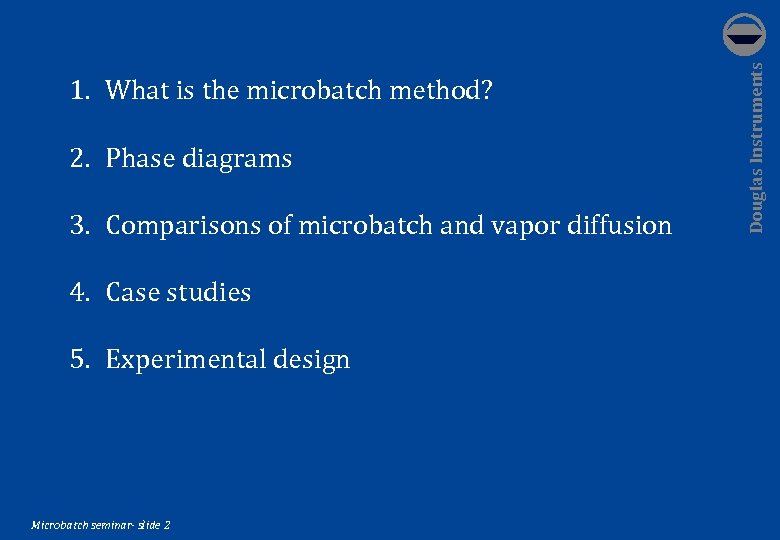 2. Phase diagrams 3. Comparisons of microbatch and vapor diffusion 4. Case studies 5. Experimental design Microbatch seminar- slide 2 Douglas Instruments 1. What is the microbatch method?