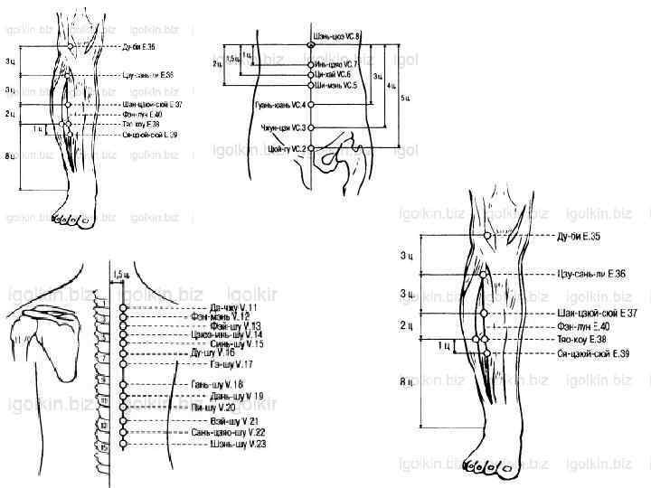 Пояснение: • SТ 39 — точка устье Тонкого Кишечника на нижних конечностях. Применяется для прекращени боли в животе; • SТ 36 тонизирует Ян и изгоняет Холод; • ВL 20 тонизирует Ян Селезенки; • Метод: тонизировать, можно применить прижигание.