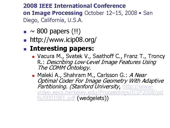 2008 IEEE International Conference on Image Processing October 12– 15, 2008 • San Diego, California, U. S. A. ~ 800 papers (!!) http: //www. icip 08. org/ Interesting papers: Vacura M. , Svatek V. , Saathoff C. , Franz T. , Troncy R. : Describing Low-Level Image Features Using The COMM Ontology. Maleki A. , Shahram M. , Carlsson G. : A Near Optimal Coder For Image Geometry With Adaptive Partitioning. (Stanford University, http: //wwwvideo. eecs. berkeley. edu/Proceedings/ICIP 2008/pd fs/0001061. pdf (wedgelets))