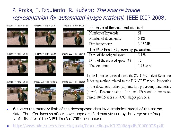 P. Praks, E. Izquierdo, R. Kučera: The sparse image representation for automated image retrieval. IEEE ICIP 2008. We keep the memory limit of the decomposed data by a statistical model of the sparse data. The effectiveness of our novel approach is demonstrated by the large scale image similarity task of the NIST Trec. Vid 2007 benchmark. http: //www-video. eecs. berkeley. edu/Proceedings/ICIP 2008/pdfs/0000025. pdf