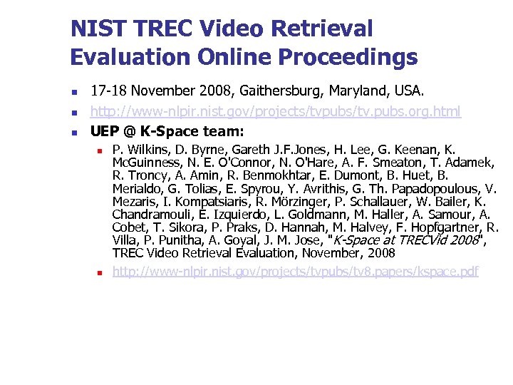 NIST TREC Video Retrieval Evaluation Online Proceedings 17 -18 November 2008, Gaithersburg, Maryland, USA. http: //www-nlpir. nist. gov/projects/tvpubs/tv. pubs. org. html UEP @ K-Space team: P. Wilkins, D. Byrne, Gareth J. F. Jones, H. Lee, G. Keenan, K. Mc. Guinness, N. E. O'Connor, N. O'Hare, A. F. Smeaton, T. Adamek, R. Troncy, A. Amin, R. Benmokhtar, E. Dumont, B. Huet, B. Merialdo, G. Tolias, E. Spyrou, Y. Avrithis, G. Th. Papadopoulous, V. Mezaris, I. Kompatsiaris, R. Mörzinger, P. Schallauer, W. Bailer, K. Chandramouli, E. Izquierdo, L. Goldmann, M. Haller, A. Samour, A. Cobet, T. Sikora, P. Praks, D. Hannah, M. Halvey, F. Hopfgartner, R. Villa, P. Punitha, A. Goyal, J. M. Jose, "K-Space at TRECVid 2008", TREC Video Retrieval Evaluation, November, 2008 http: //www-nlpir. nist. gov/projects/tvpubs/tv 8. papers/kspace. pdf