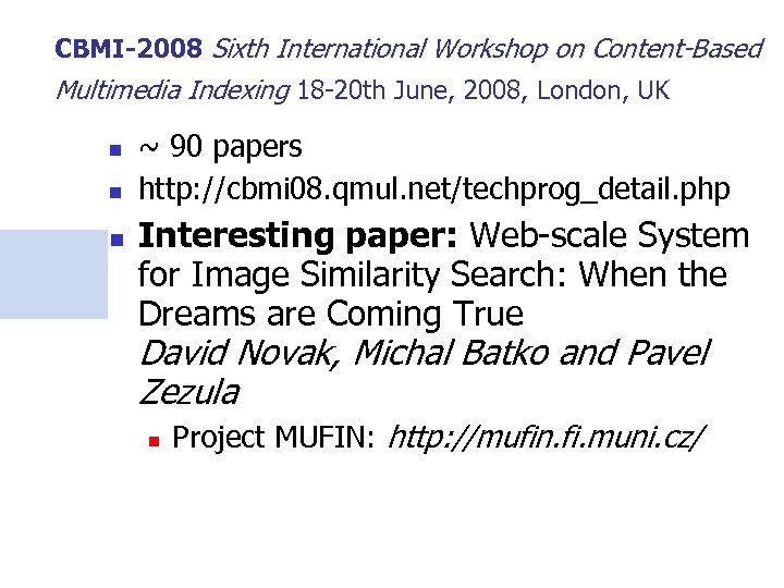 CBMI-2008 Sixth International Workshop on Content-Based Multimedia Indexing 18 -20 th June, 2008, London, UK ~ 90 papers http: //cbmi 08. qmul. net/techprog_detail. php Interesting paper: Web-scale System for Image Similarity Search: When the Dreams are Coming True David Novak, Michal Batko and Pavel Zezula Project MUFIN: http: //mufin. fi. muni. cz/