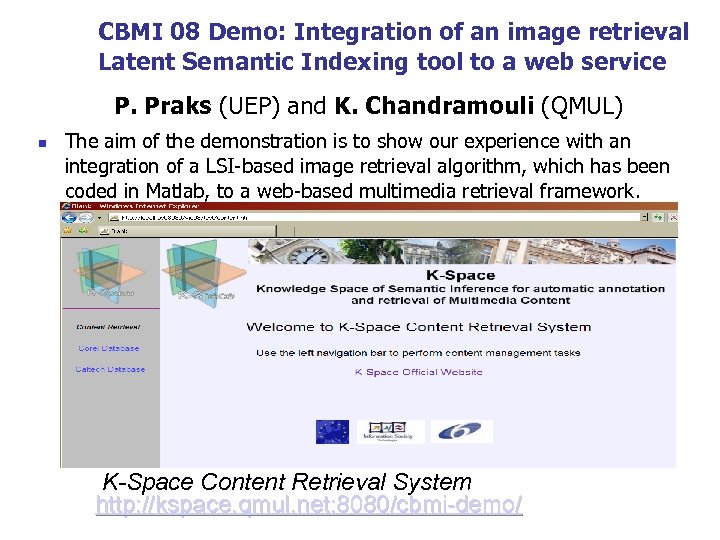 CBMI 08 Demo: Integration of an image retrieval Latent Semantic Indexing tool to a web service P. Praks (UEP) and K. Chandramouli (QMUL) The aim of the demonstration is to show our experience with an integration of a LSI-based image retrieval algorithm, which has been coded in Matlab, to a web-based multimedia retrieval framework. K-Space Content Retrieval System http: //kspace. qmul. net: 8080/cbmi-demo/