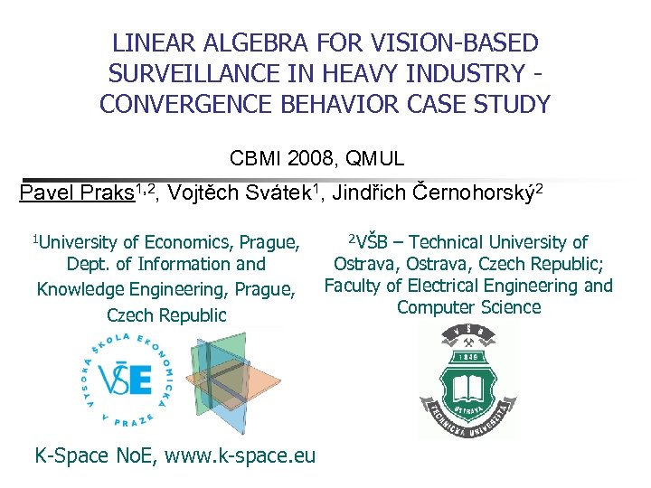 LINEAR ALGEBRA FOR VISION-BASED SURVEILLANCE IN HEAVY INDUSTRY CONVERGENCE BEHAVIOR CASE STUDY CBMI 2008, QMUL Pavel Praks 1, 2, Vojtěch Svátek 1, Jindřich Černohorský 2 1 University of Economics, Prague, Dept. of Information and Knowledge Engineering, Prague, Czech Republic K-Space No. E, www. k-space. eu 2 VŠB – Technical University of Ostrava, Czech Republic; Faculty of Electrical Engineering and Computer Science