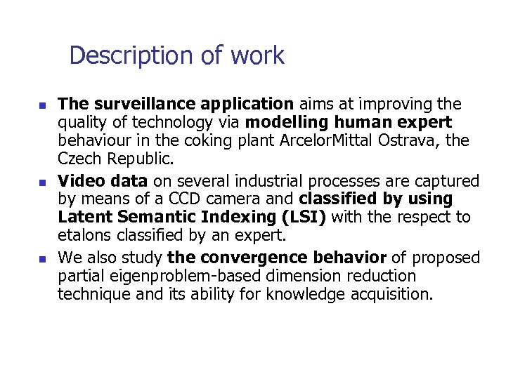 Description of work The surveillance application aims at improving the quality of technology via modelling human expert behaviour in the coking plant Arcelor. Mittal Ostrava, the Czech Republic. Video data on several industrial processes are captured by means of a CCD camera and classified by using Latent Semantic Indexing (LSI) with the respect to etalons classified by an expert. We also study the convergence behavior of proposed partial eigenproblem-based dimension reduction technique and its ability for knowledge acquisition.