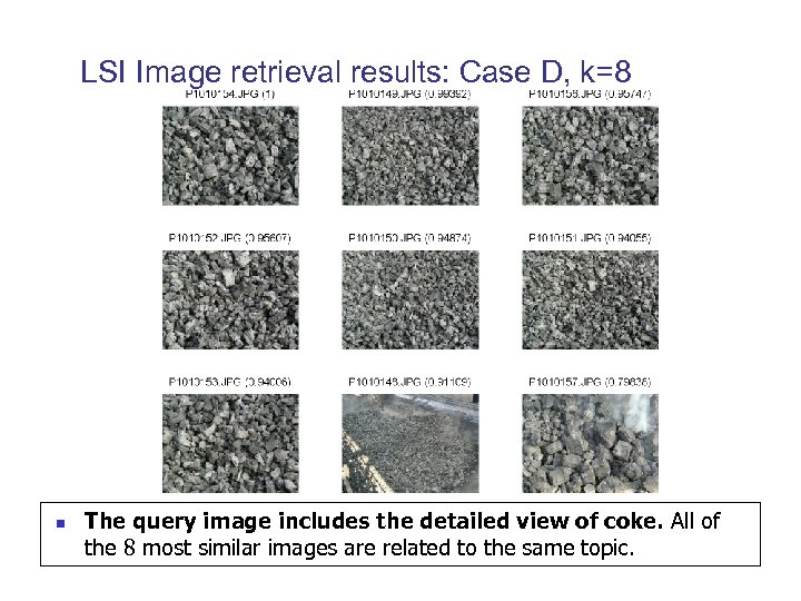 Case studies of images taken from the coking plant Arcelor. Mittal Ostrava, CZ Subjective evaluation of LSI-based results related to these two different settings: Experiment 1: k = 8 largest singular values is assumed Experiment 2: k = 45 largest singular values were used for LSI. For each case, query image represents a different industrial process. Image retrieval results are presented by decreasing order of similarity. The query image is situated in the upper left corner. (The similarity of the query image and the retrieved image is written in parentheses. ) In order to achieve well arranged results, only 9 most significant images are presented.