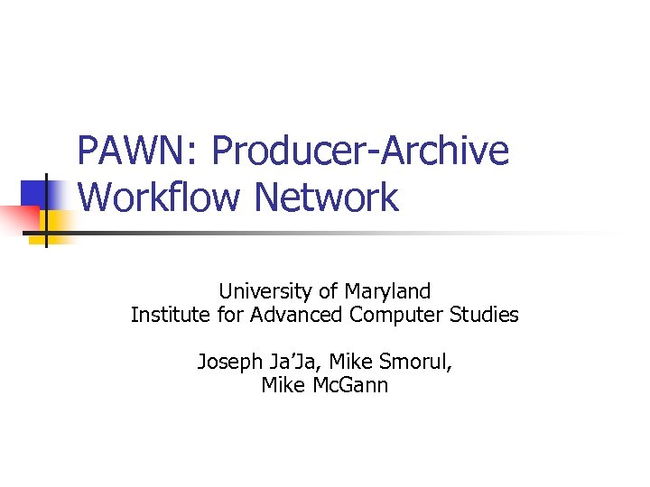 PAWN: Producer-Archive Workflow Network University of Maryland Institute for Advanced Computer Studies Joseph Ja’Ja, Mike Smorul, Mike Mc. Gann