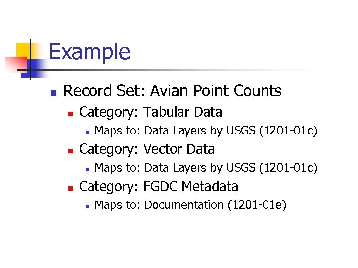 Example n Record Set: Avian Point Counts n Category: Tabular Data n n Category: Vector Data n n Maps to: Data Layers by USGS (1201 -01 c) Category: FGDC Metadata n Maps to: Documentation (1201 -01 e)