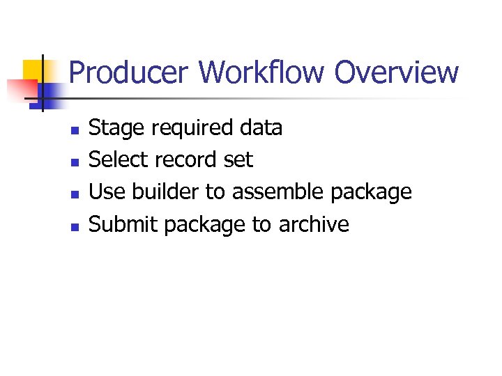 Producer Workflow Overview n n Stage required data Select record set Use builder to assemble package Submit package to archive