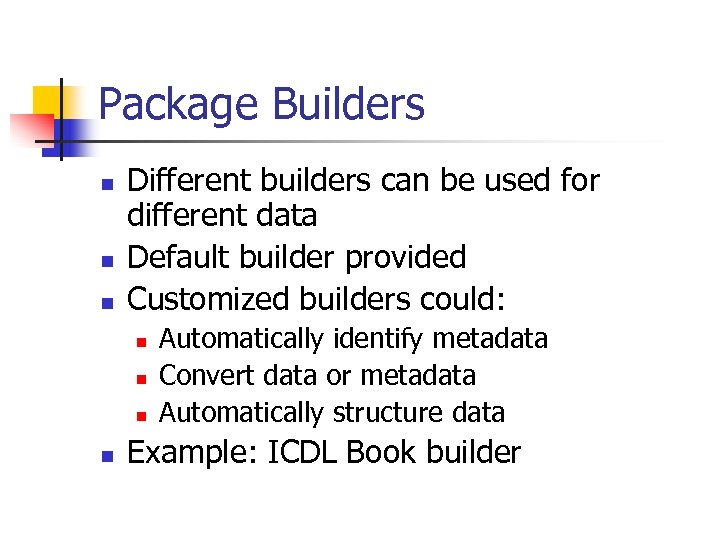Package Builders n n n Different builders can be used for different data Default builder provided Customized builders could: n n Automatically identify metadata Convert data or metadata Automatically structure data Example: ICDL Book builder