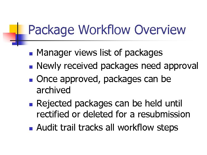 Package Workflow Overview n n n Manager views list of packages Newly received packages need approval Once approved, packages can be archived Rejected packages can be held until rectified or deleted for a resubmission Audit trail tracks all workflow steps