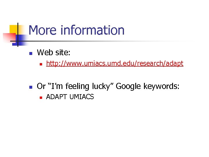 More information n Web site: n n http: //www. umiacs. umd. edu/research/adapt Or “I’m feeling lucky” Google keywords: n ADAPT UMIACS