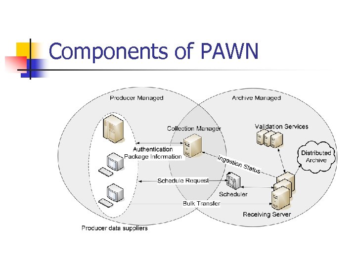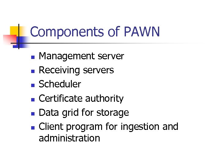 Components of PAWN n n n Management server Receiving servers Scheduler Certificate authority Data grid for storage Client program for ingestion and administration