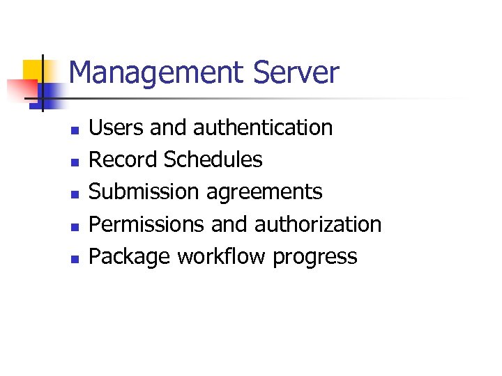 Management Server n n n Users and authentication Record Schedules Submission agreements Permissions and authorization Package workflow progress
