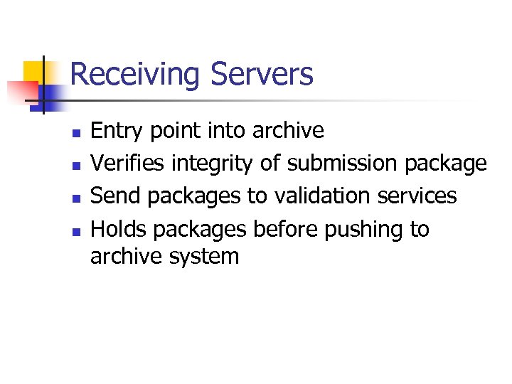 Receiving Servers n n Entry point into archive Verifies integrity of submission package Send packages to validation services Holds packages before pushing to archive system