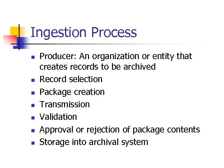 Ingestion Process n n n n Producer: An organization or entity that creates records to be archived Record selection Package creation Transmission Validation Approval or rejection of package contents Storage into archival system