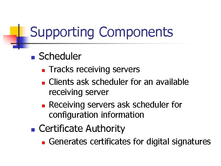Supporting Components n Scheduler n n Tracks receiving servers Clients ask scheduler for an available receiving server Receiving servers ask scheduler for configuration information Certificate Authority n Generates certificates for digital signatures