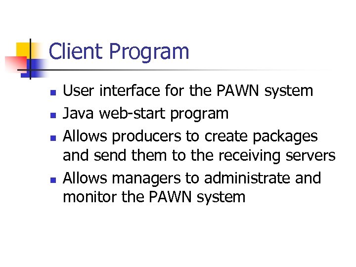 Client Program n n User interface for the PAWN system Java web-start program Allows producers to create packages and send them to the receiving servers Allows managers to administrate and monitor the PAWN system