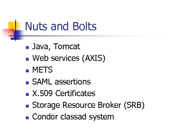 Nuts and Bolts n n n n Java, Tomcat Web services (AXIS) METS SAML assertions X. 509 Certificates Storage Resource Broker (SRB) Condor classad system