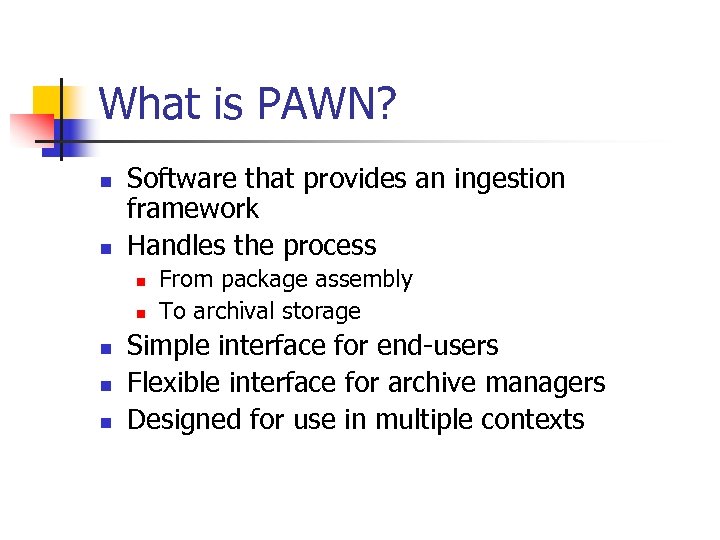 What is PAWN? n n Software that provides an ingestion framework Handles the process n n n From package assembly To archival storage Simple interface for end-users Flexible interface for archive managers Designed for use in multiple contexts
