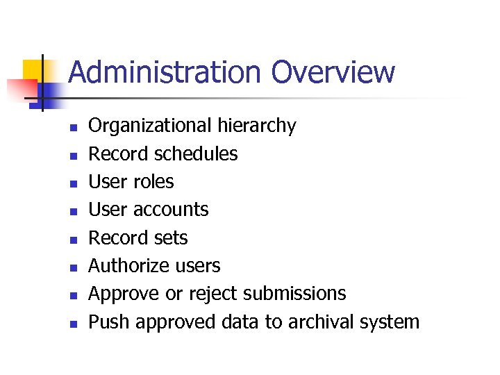 Administration Overview n n n n Organizational hierarchy Record schedules User roles User accounts Record sets Authorize users Approve or reject submissions Push approved data to archival system