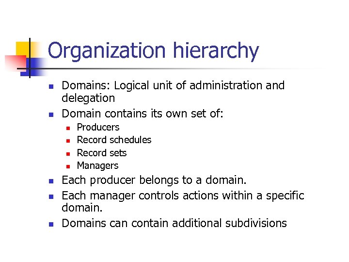 Organization hierarchy n n Domains: Logical unit of administration and delegation Domain contains its own set of: n n n n Producers Record schedules Record sets Managers Each producer belongs to a domain. Each manager controls actions within a specific domain. Domains can contain additional subdivisions