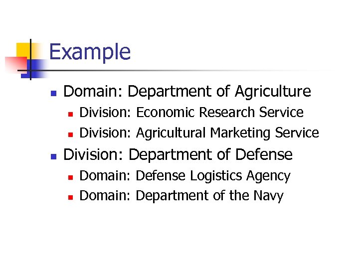 Example n Domain: Department of Agriculture n n n Division: Economic Research Service Division: Agricultural Marketing Service Division: Department of Defense n n Domain: Defense Logistics Agency Domain: Department of the Navy