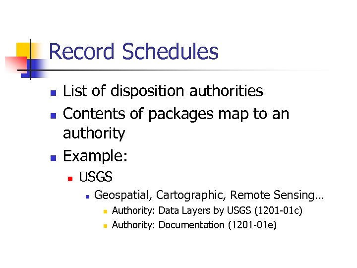 Record Schedules n n n List of disposition authorities Contents of packages map to an authority Example: n USGS n Geospatial, Cartographic, Remote Sensing… n n Authority: Data Layers by USGS (1201 -01 c) Authority: Documentation (1201 -01 e)