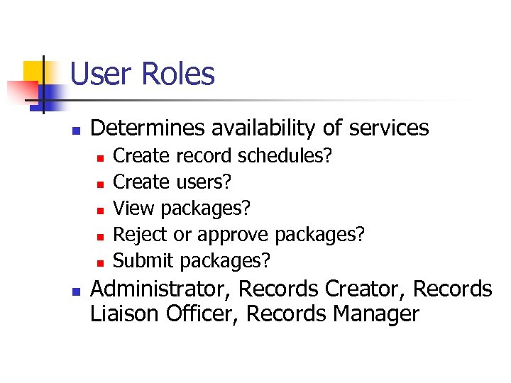 User Roles n Determines availability of services n n n Create record schedules? Create users? View packages? Reject or approve packages? Submit packages? Administrator, Records Creator, Records Liaison Officer, Records Manager