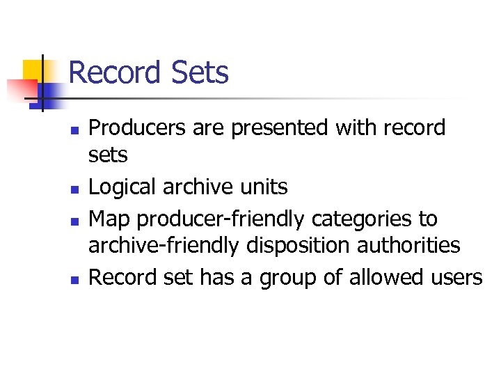 Record Sets n n Producers are presented with record sets Logical archive units Map producer-friendly categories to archive-friendly disposition authorities Record set has a group of allowed users