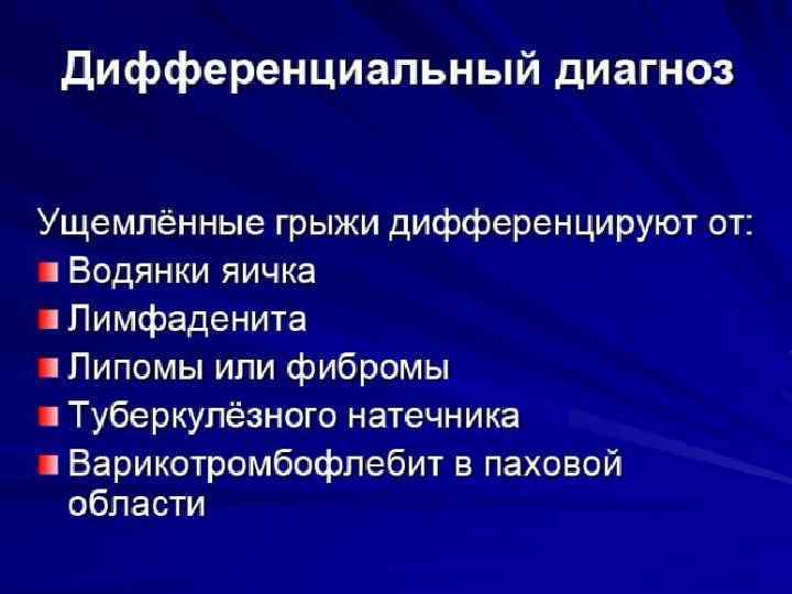 Осложнения паховой грыжи (при отсутствии своевременно оказанной медицинской помощи): ущемление паховой грыжи (сдавливание грыжи в отверстии, через которое она выходит); ишемический орхит (воспаление яичка); копростаз (застойные явления каловых масс в кишечнике); воспаление паховой грыжи.