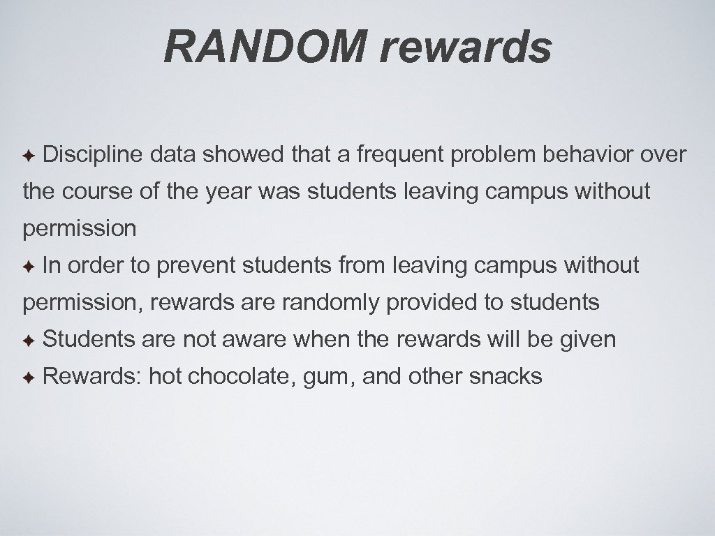 RANDOM rewards Discipline data showed that a frequent problem behavior over the course of the year was students leaving campus without permission In order to prevent students from leaving campus without permission, rewards are randomly provided to students Students are not aware when the rewards will be given Rewards: hot chocolate, gum, and other snacks