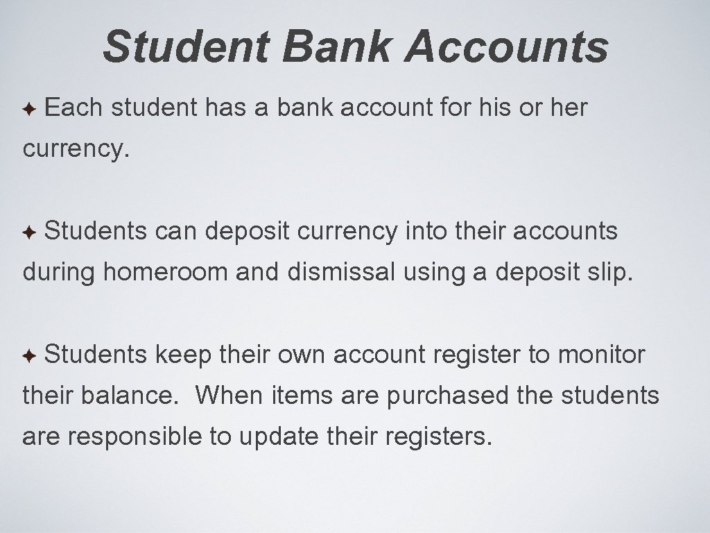 Student Bank Accounts Each student has a bank account for his or her currency. Students can deposit currency into their accounts during homeroom and dismissal using a deposit slip. Students keep their own account register to monitor their balance. When items are purchased the students are responsible to update their registers.