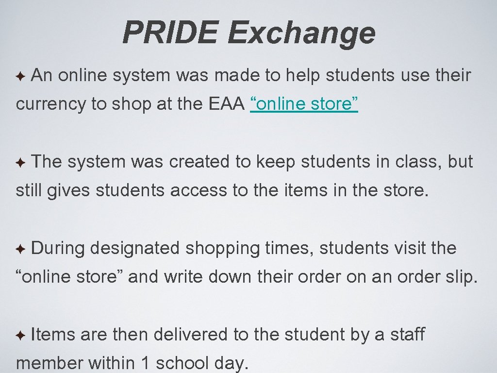 PRIDE Exchange An online system was made to help students use their currency to shop at the EAA “online store” The system was created to keep students in class, but still gives students access to the items in the store. During designated shopping times, students visit the “online store” and write down their order on an order slip. Items are then delivered to the student by a staff member within 1 school day.