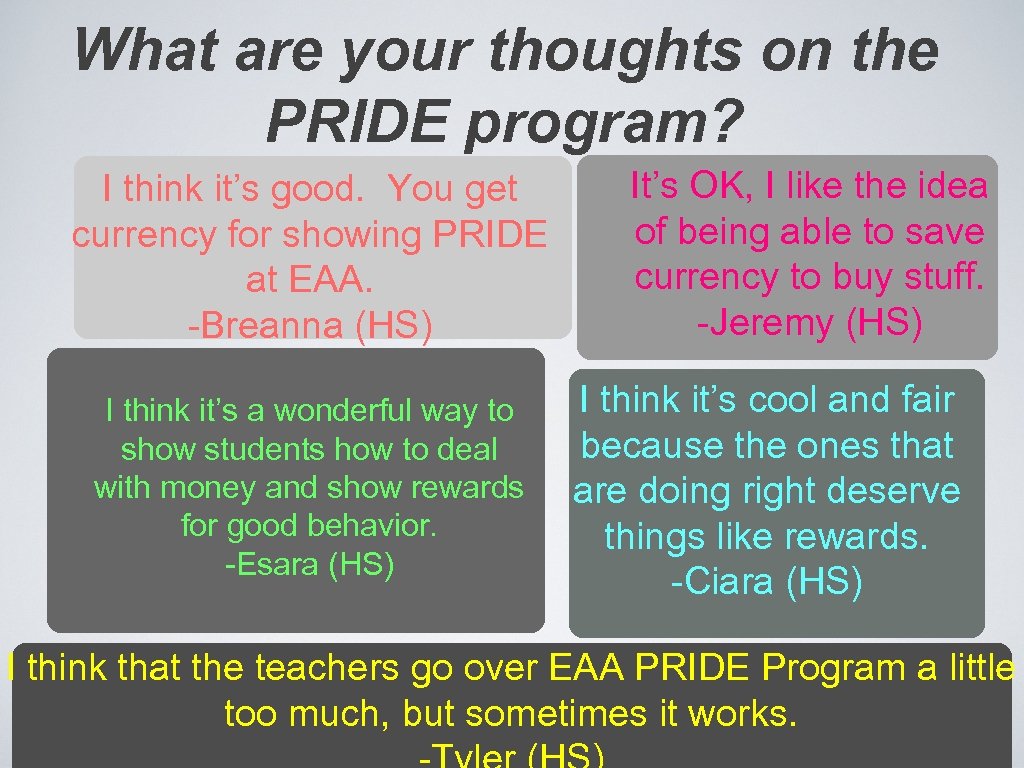 What are your thoughts on the PRIDE program? I think it’s good. You get currency for showing PRIDE at EAA. -Breanna (HS) I think it’s a wonderful way to show students how to deal with money and show rewards for good behavior. -Esara (HS) It’s OK, I like the idea of being able to save currency to buy stuff. -Jeremy (HS) I think it’s cool and fair because the ones that are doing right deserve things like rewards. -Ciara (HS) I think that the teachers go over EAA PRIDE Program a little too much, but sometimes it works.