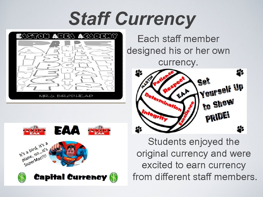 Staff Currency Each staff member designed his or her own currency. Students enjoyed the original currency and were excited to earn currency from different staff members.