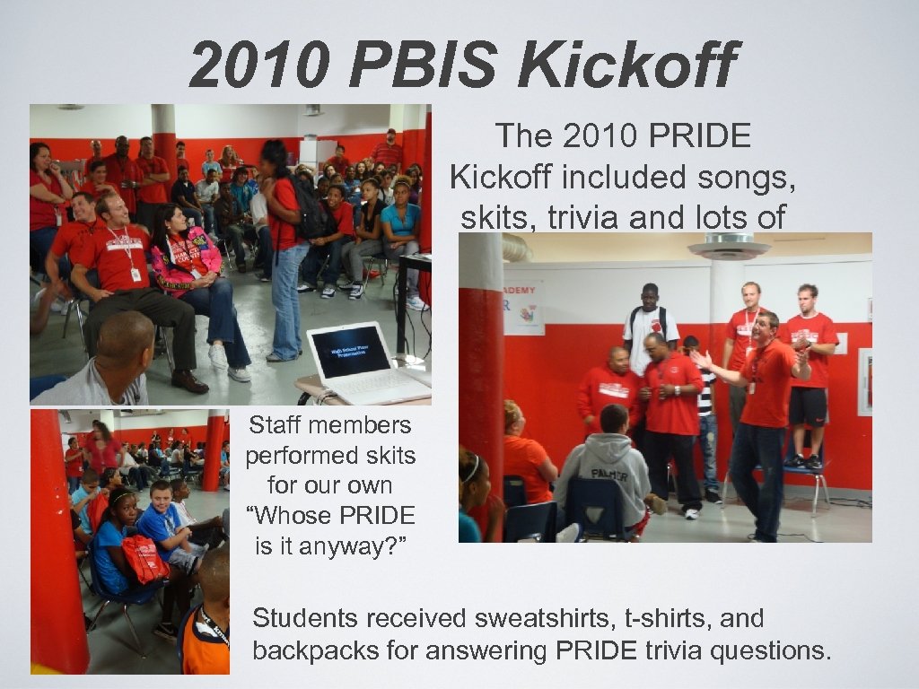 2010 PBIS Kickoff The 2010 PRIDE Kickoff included songs, skits, trivia and lots of prizes. Staff members performed skits for our own “Whose PRIDE is it anyway? ” Students received sweatshirts, t-shirts, and backpacks for answering PRIDE trivia questions.