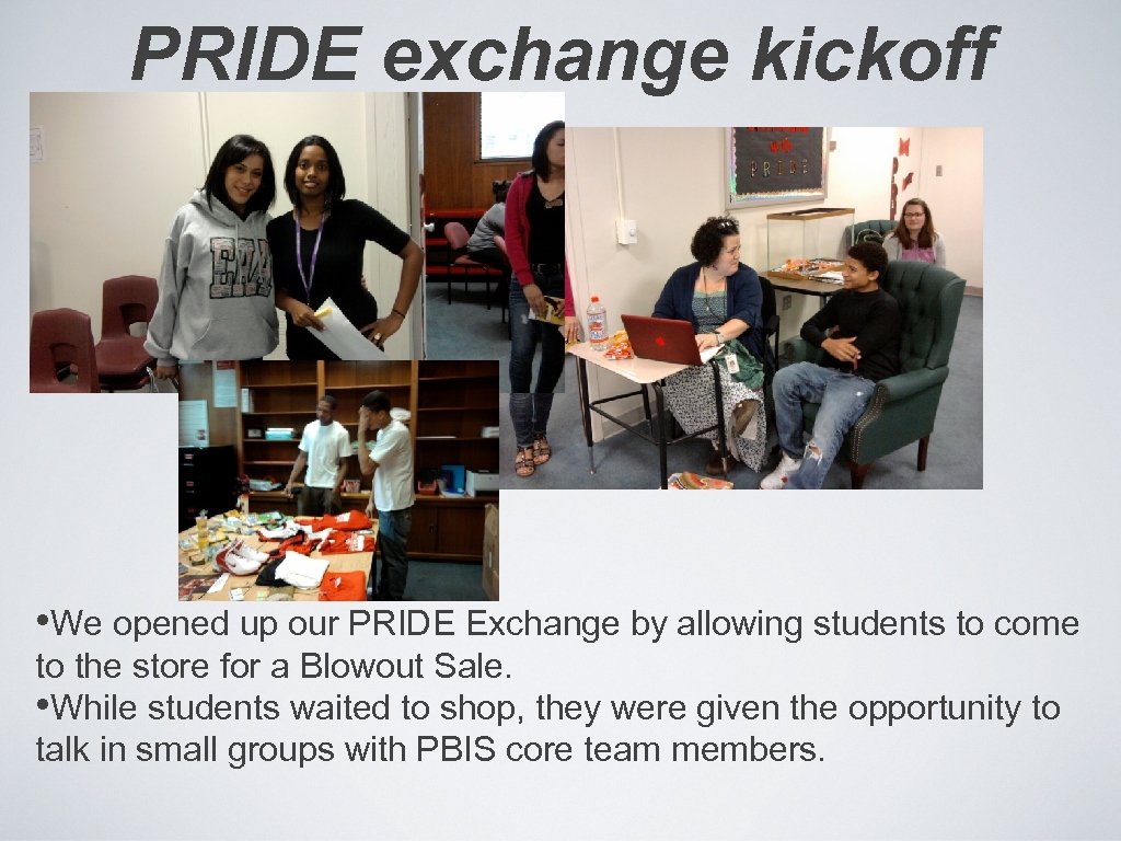 PRIDE exchange kickoff • We opened up our PRIDE Exchange by allowing students to come to the store for a Blowout Sale. • While students waited to shop, they were given the opportunity to talk in small groups with PBIS core team members.